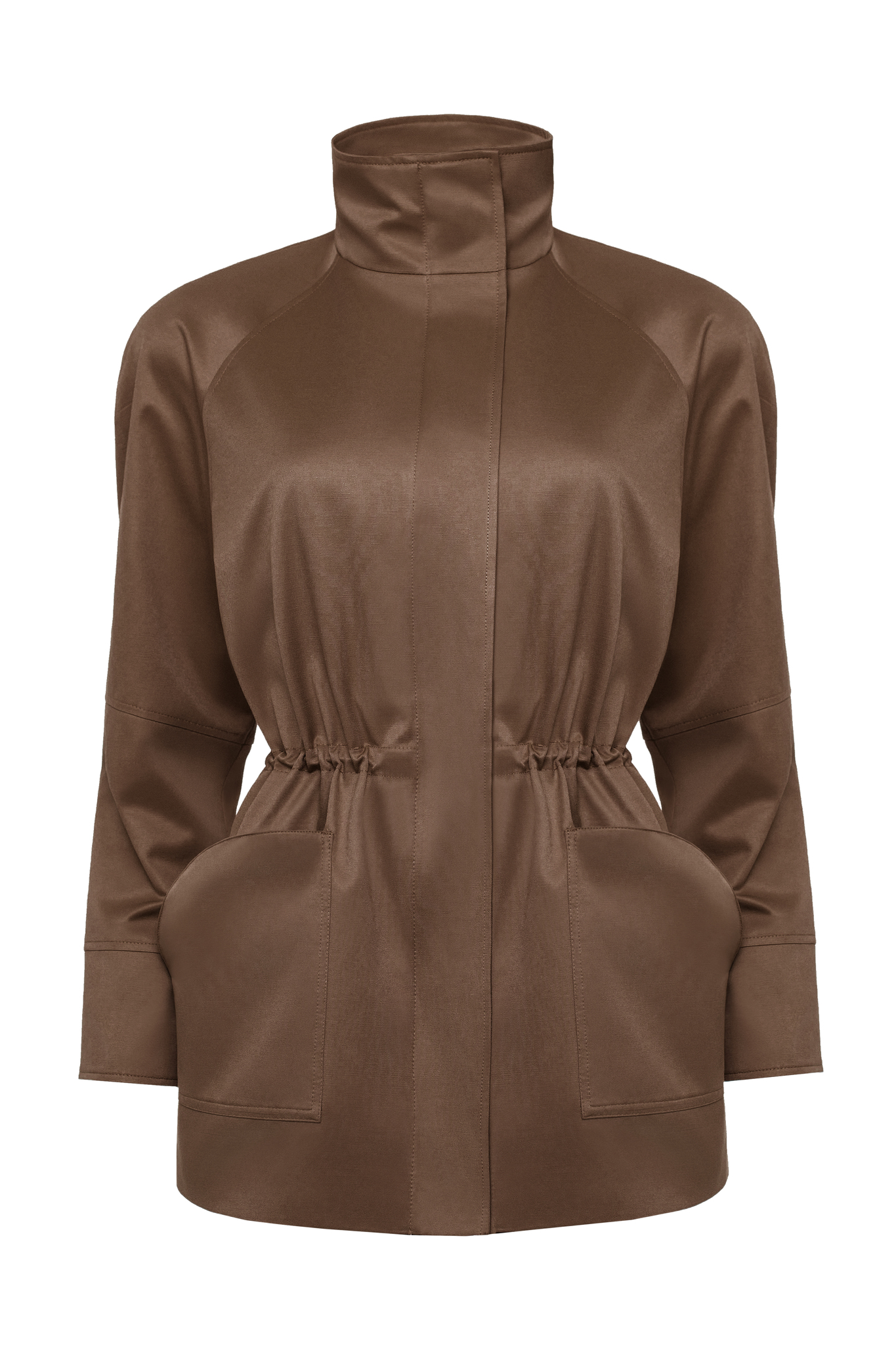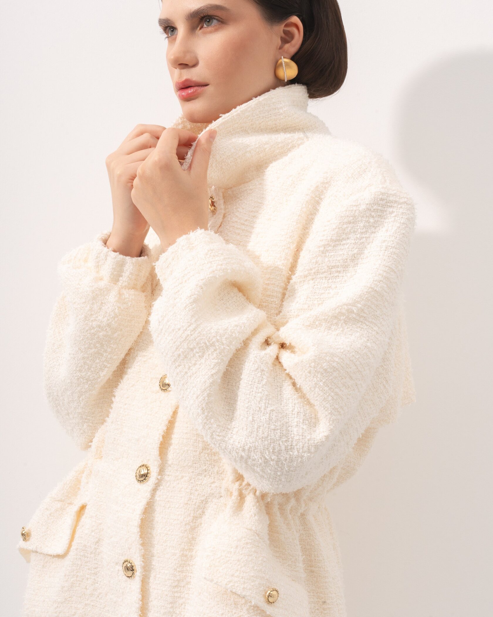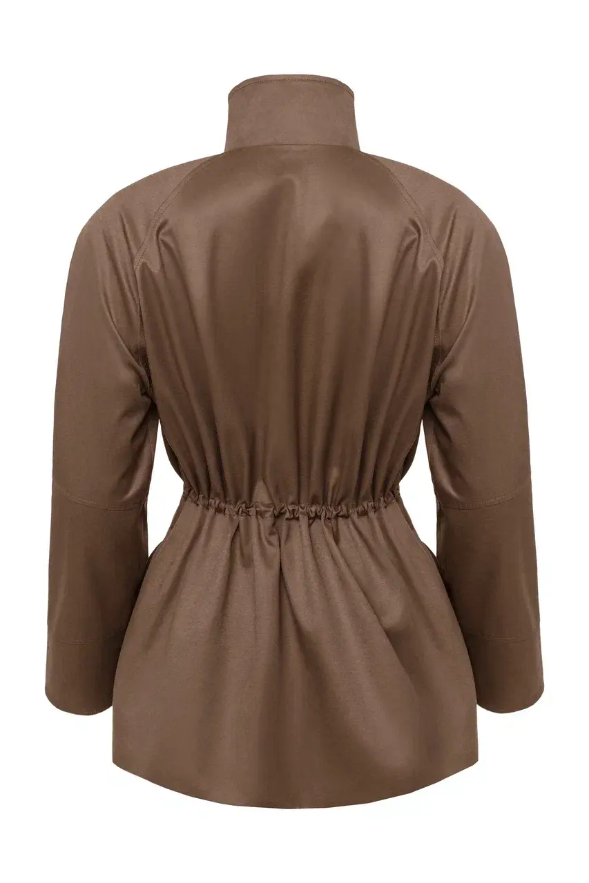 Модель выполнена с акцентом на талию — кулиска позволяет регулировать посадку и создавать женственный силуэт. Высокий воротник защищает от ветра, а крупные накладные карманы добавляют практичности и актуальности. Минималистичная застёжка скрытого типа поддерживает лаконичный дизайн.
