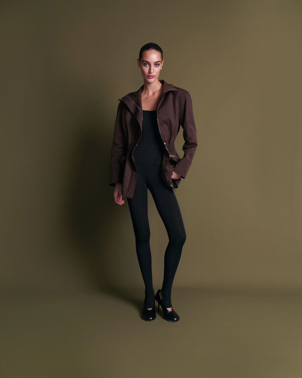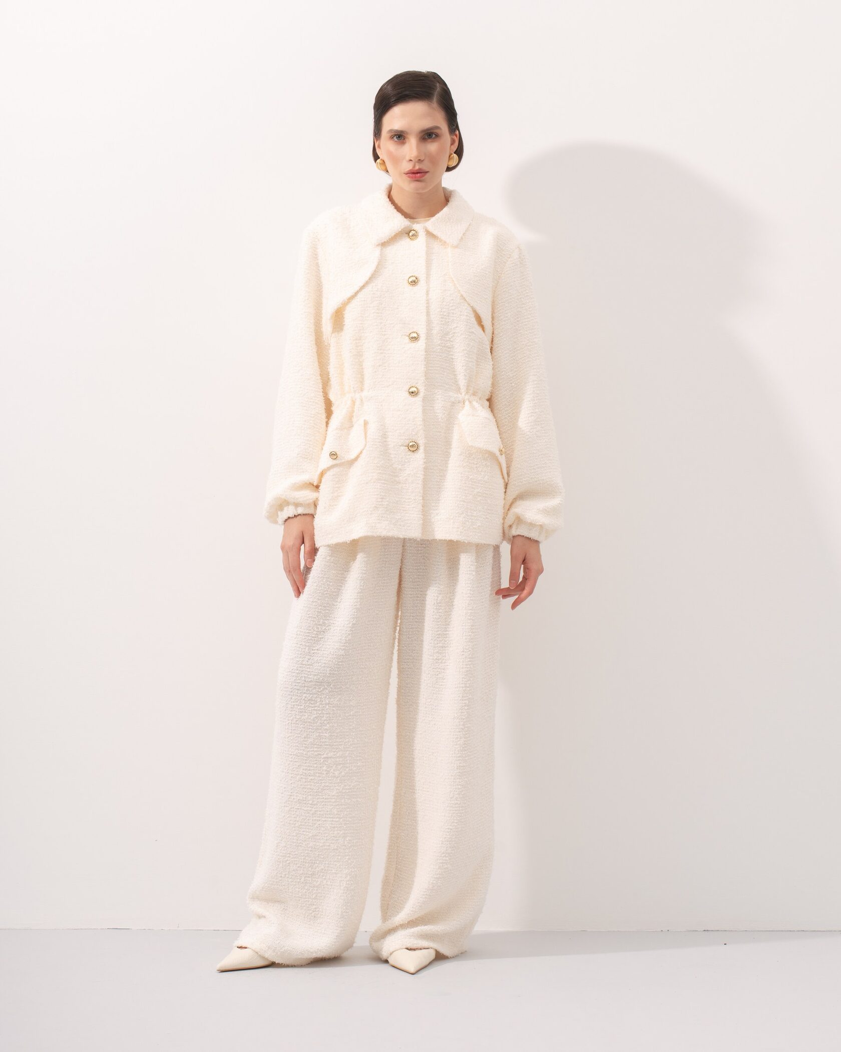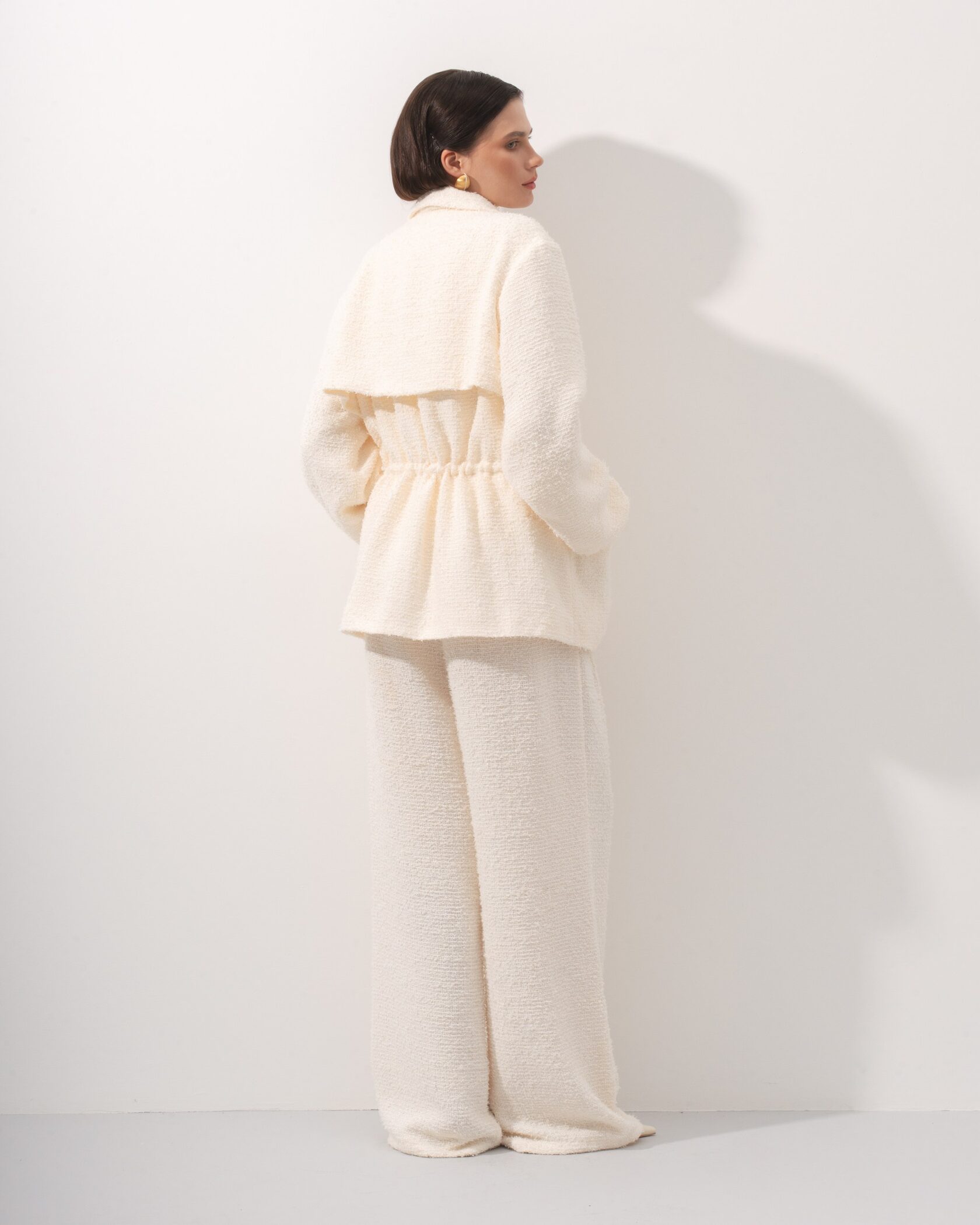 Модель выполнена с акцентом на талию — кулиска позволяет регулировать посадку и создавать женственный силуэт. Высокий воротник защищает от ветра, а крупные накладные карманы добавляют практичности и актуальности. Минималистичная застёжка скрытого типа поддерживает лаконичный дизайн.