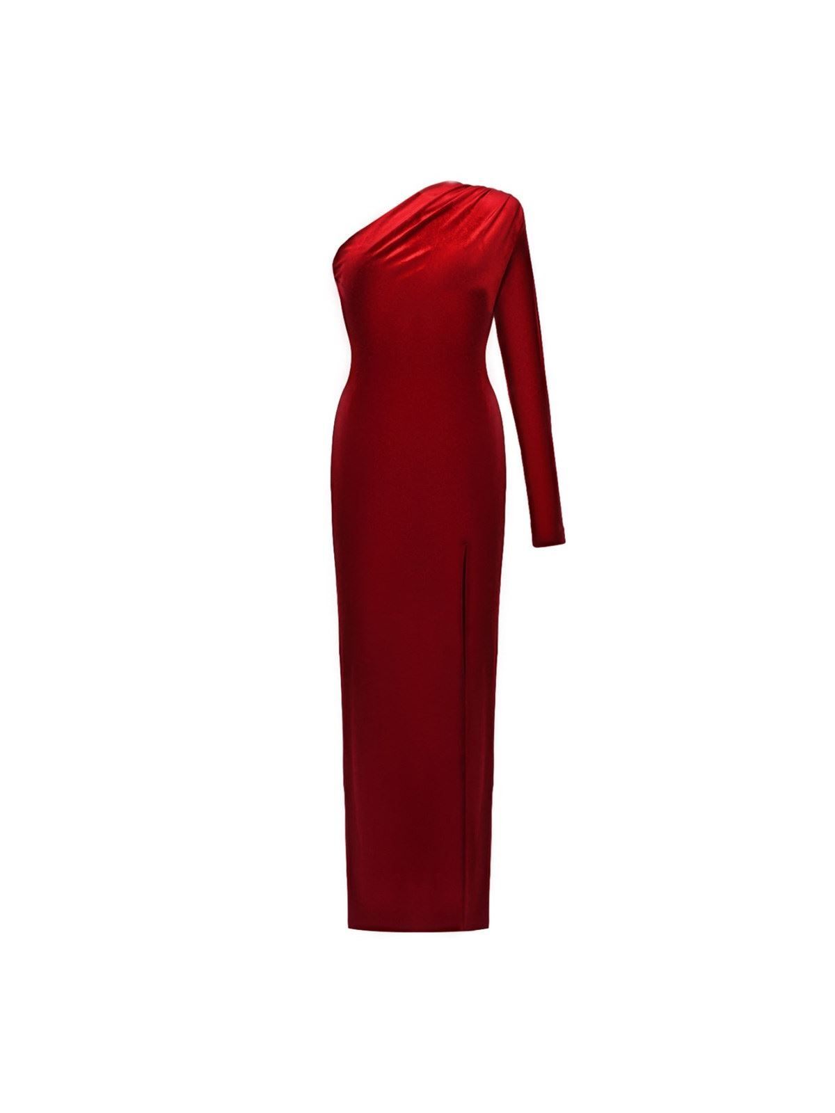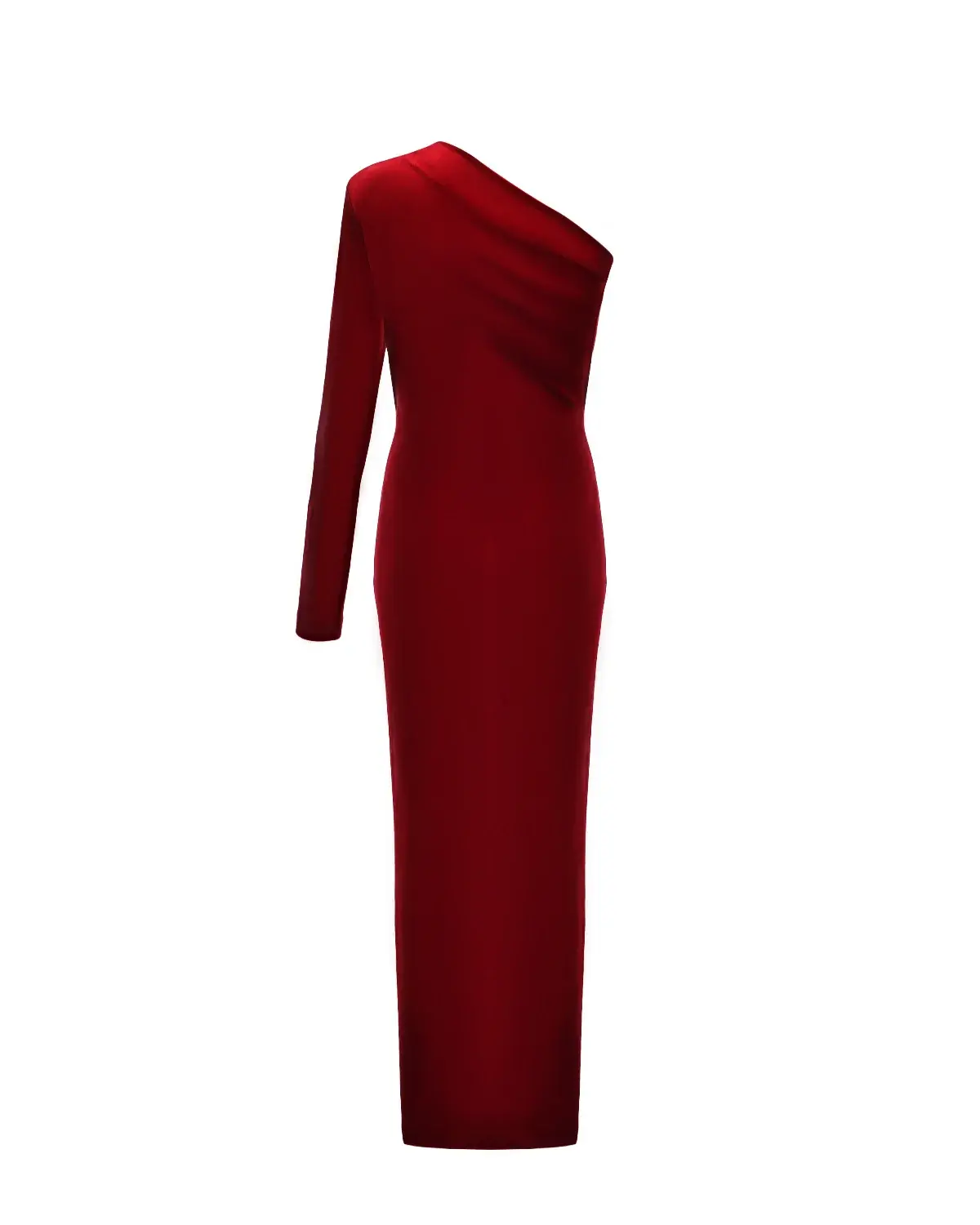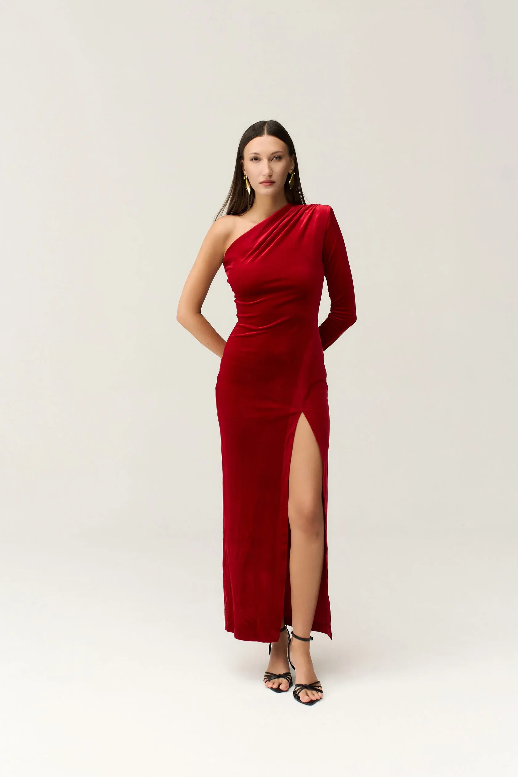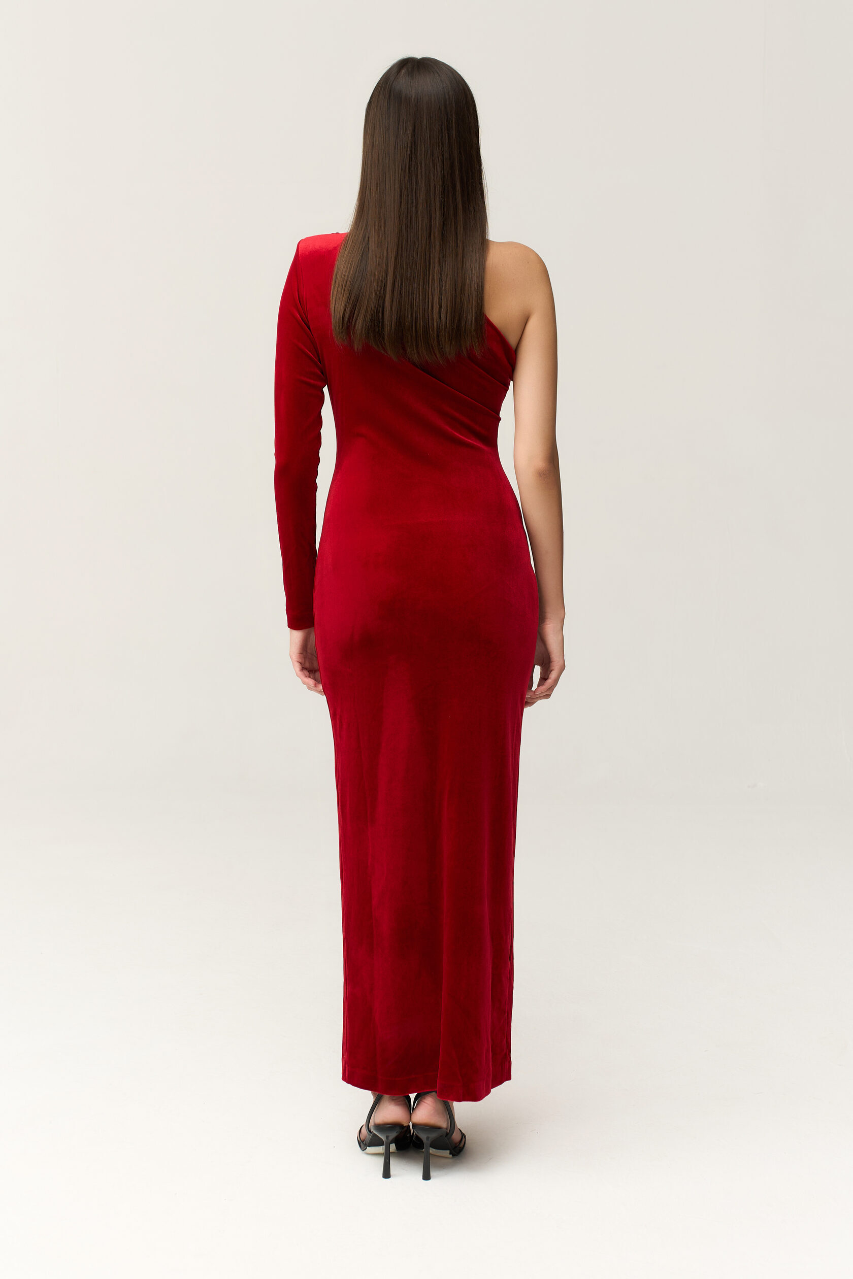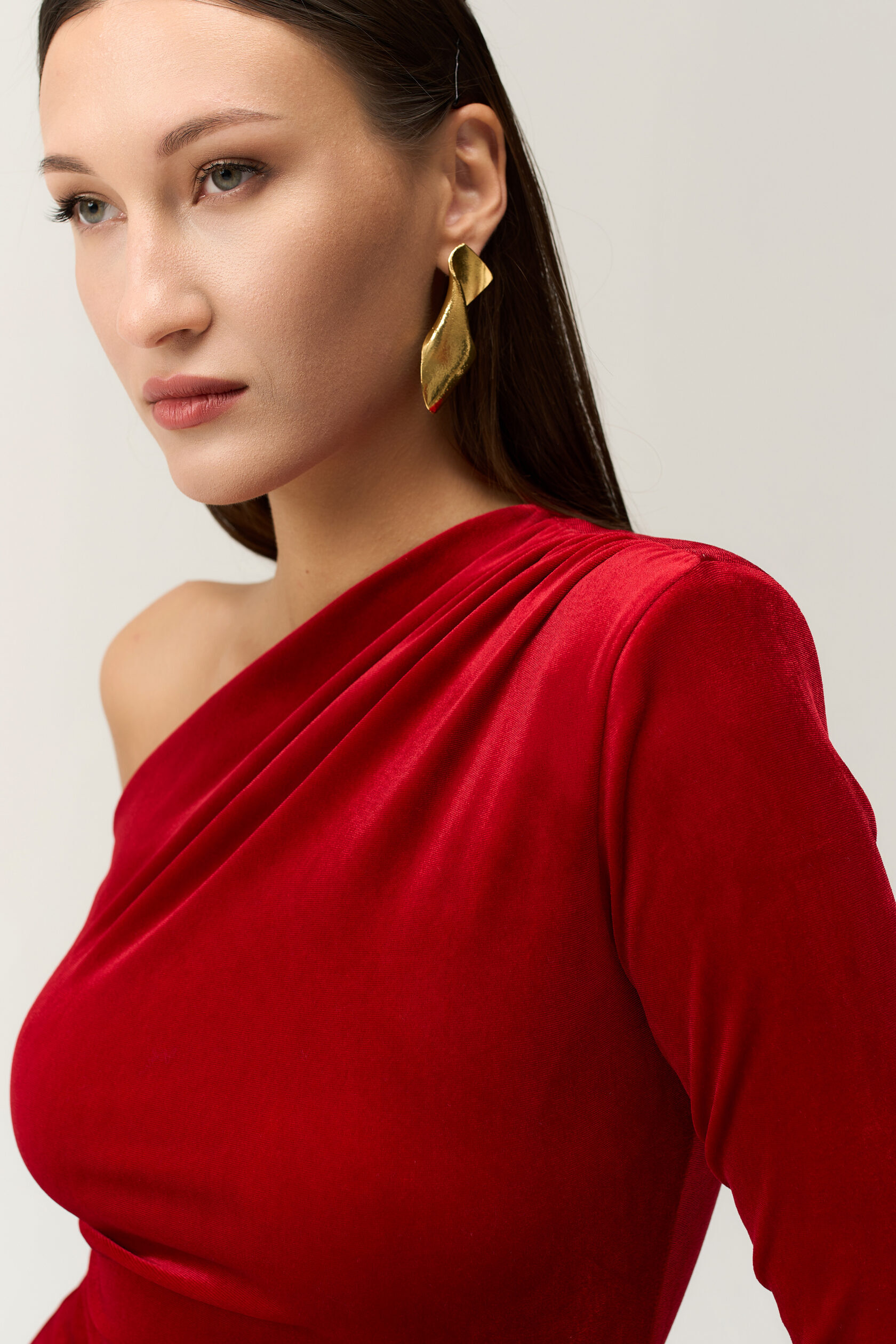 Бархатное асимметричное платье красного цвета — это смелый выбор, который привлекает внимание и выделяется из толпы. Гладкий бархат и необычный крой создают эффектный и современный образ, идеально подходящий для вечерних мероприятий или особых случаев в сочетании с элегантными туфлями и выразительными аксессуарами.