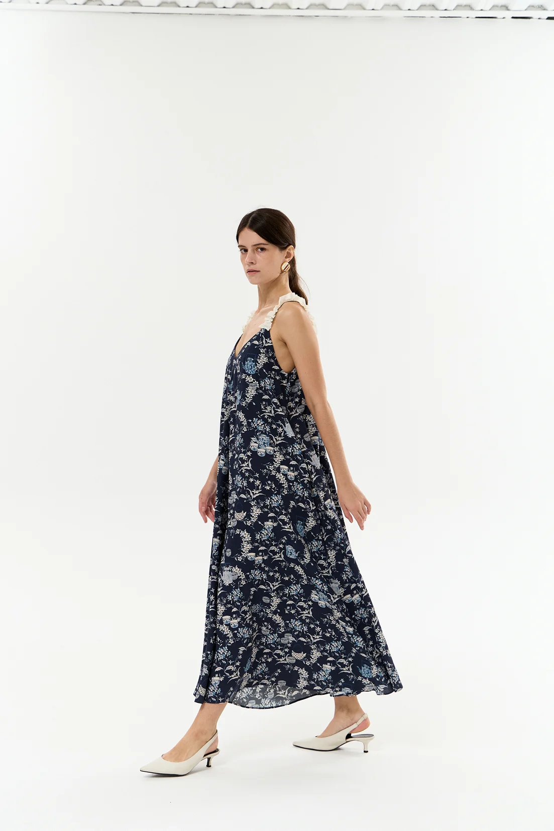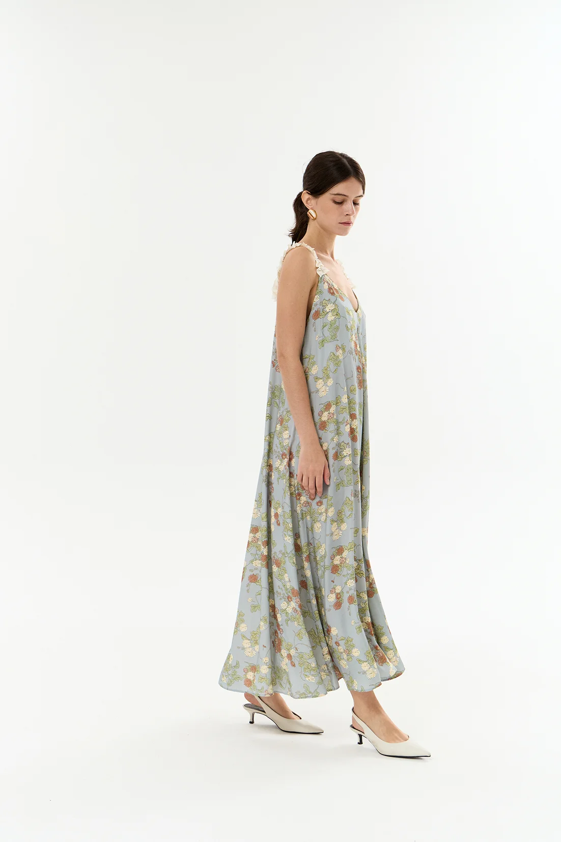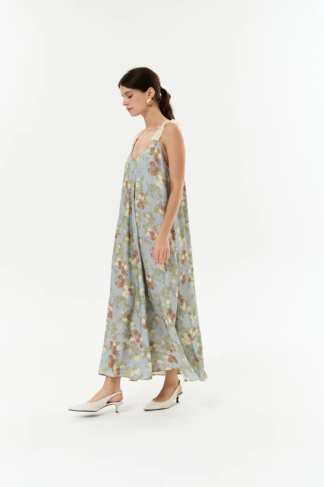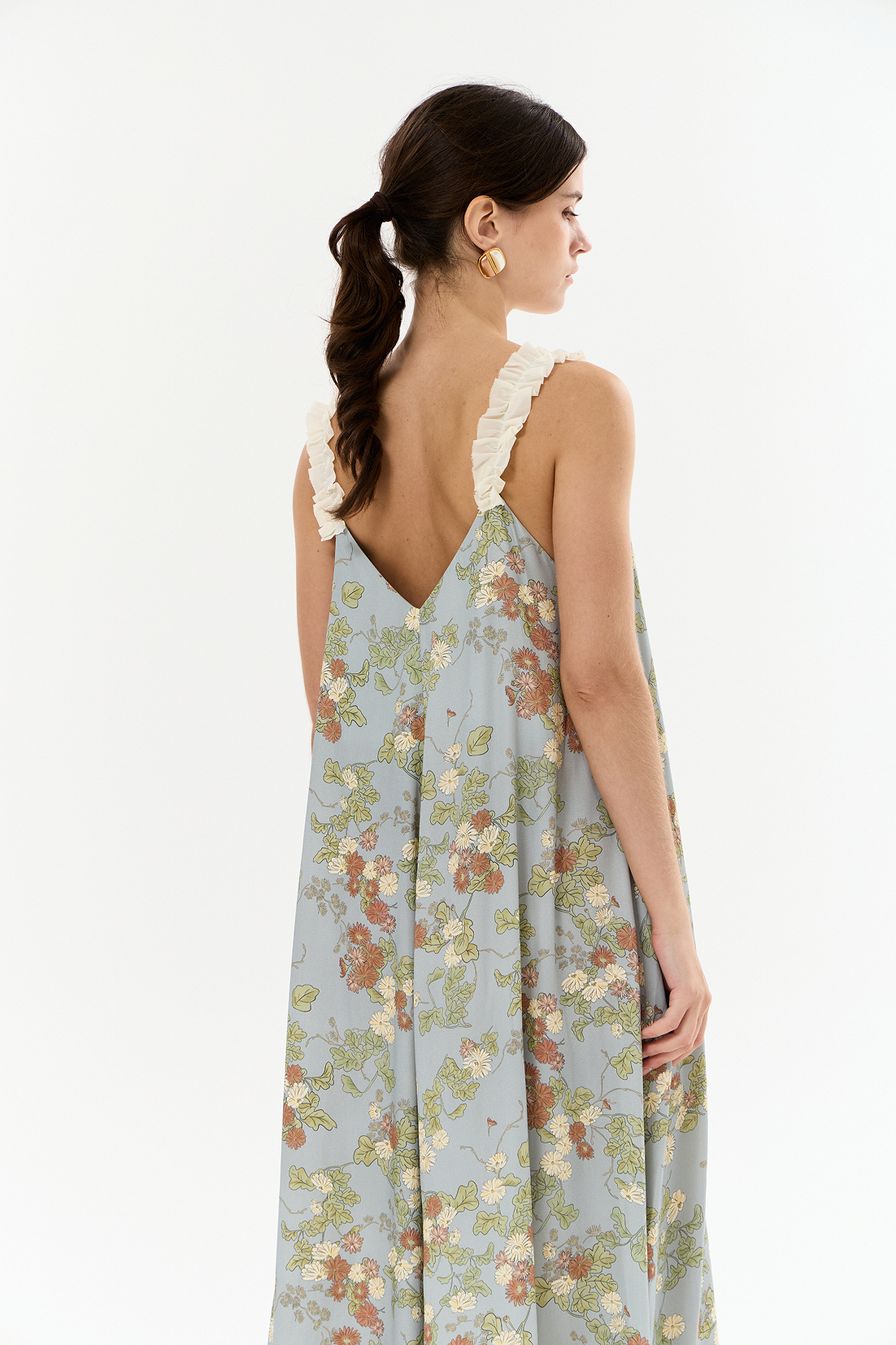 Платье макси из струящейся вискозы в духе романтичного и свободного стиля бохо.Главная изюминка скрыта в деталях - съемные рюши из шёлка.