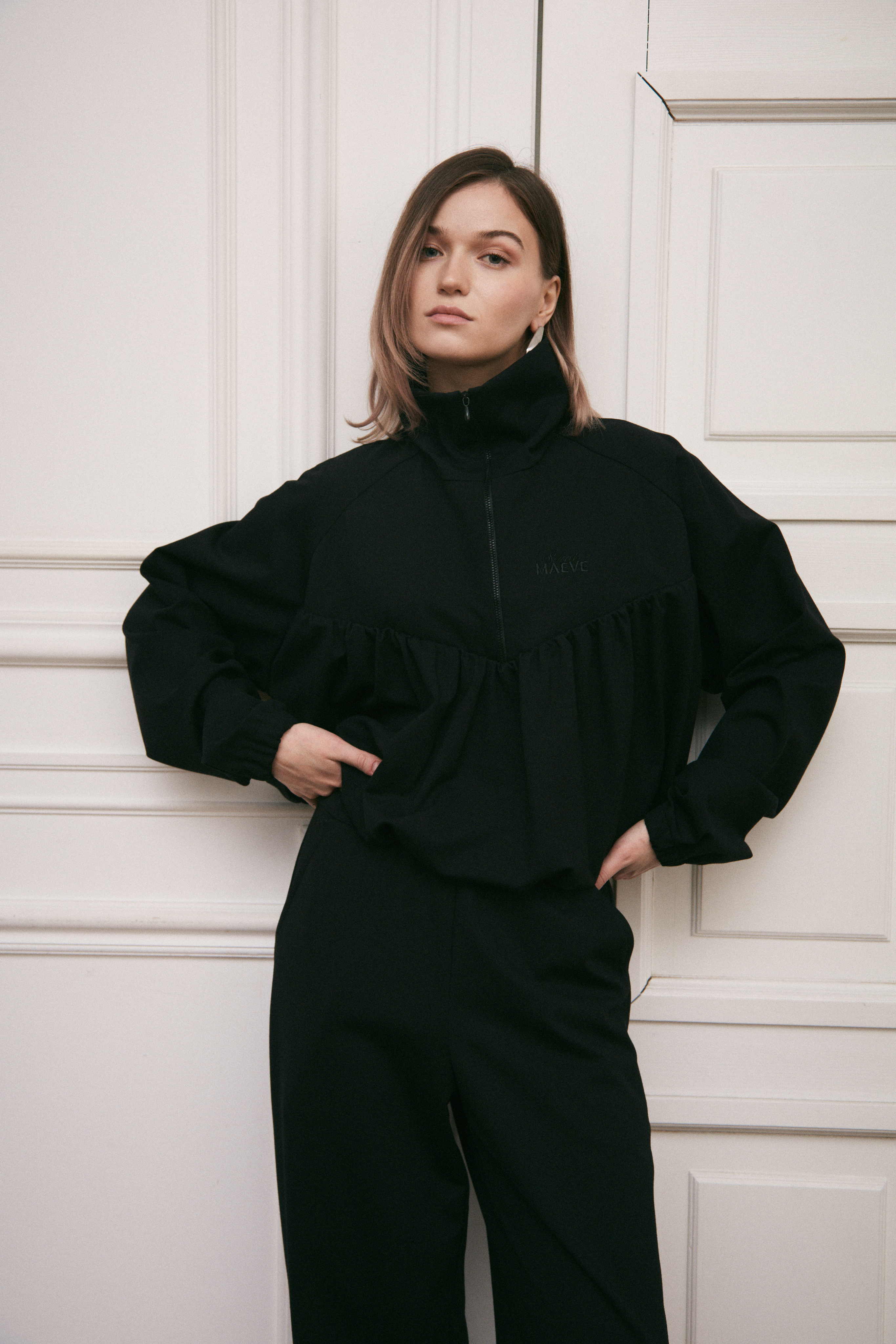 Блуза-анорак на молнии из нежной костюмной ткани жемчужного оттенка