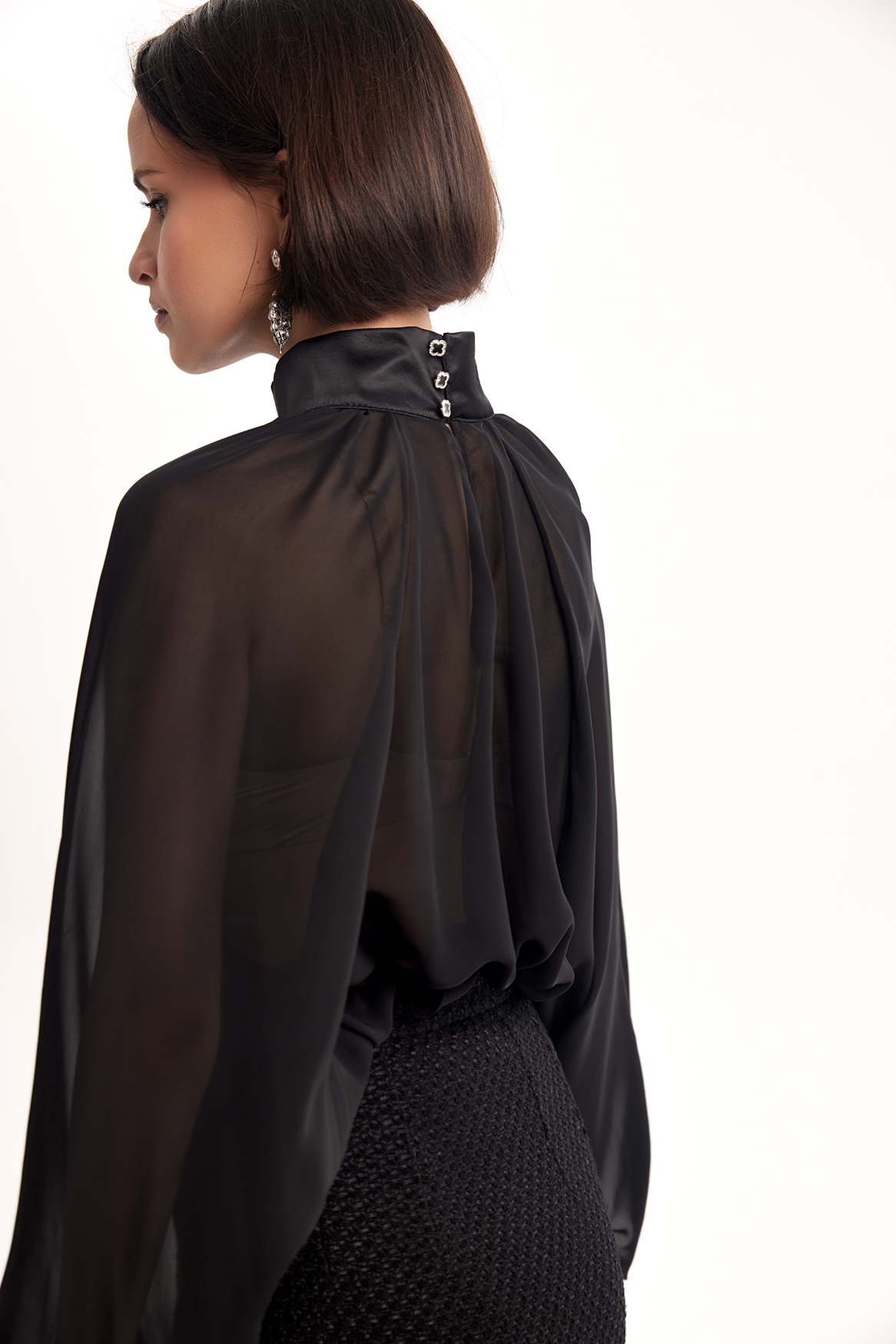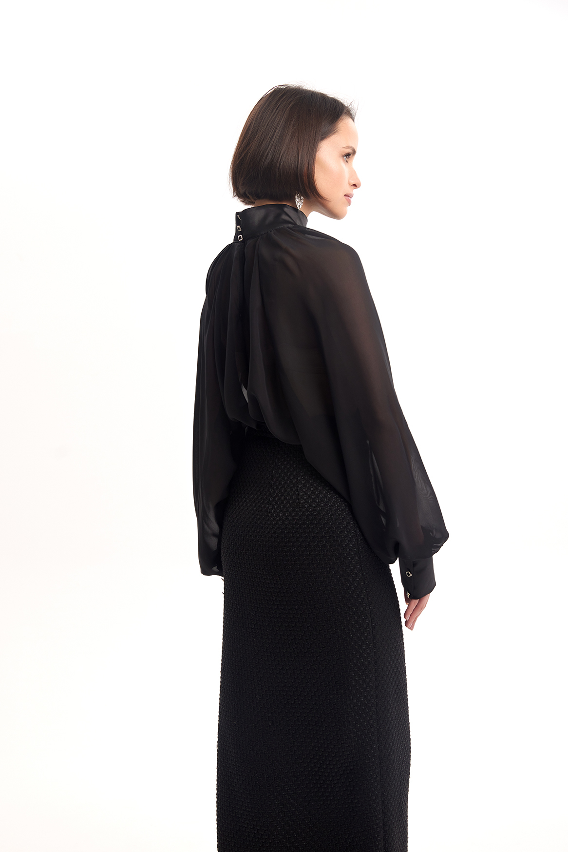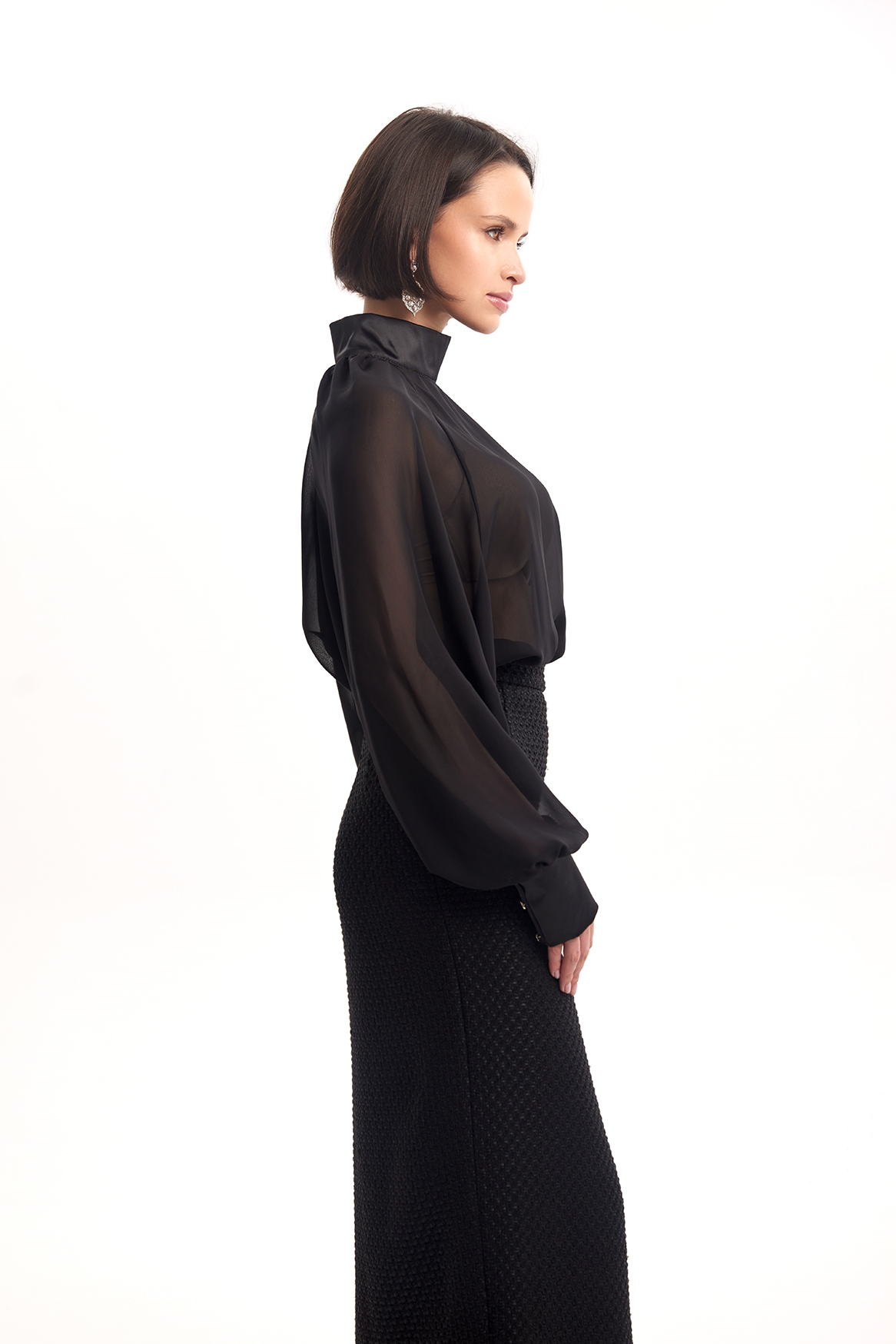 Полупрозрачная блузка свободного кроя из легкой воздушной ткани. Высокий воротник-стойка и длинные рукава создают изысканный силуэт, а прозрачная текстура добавляет образу лёгкости и утончённой смелости.
