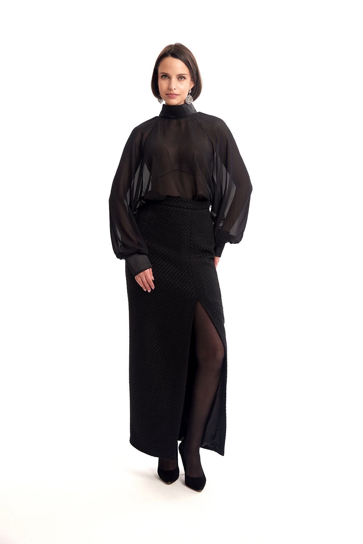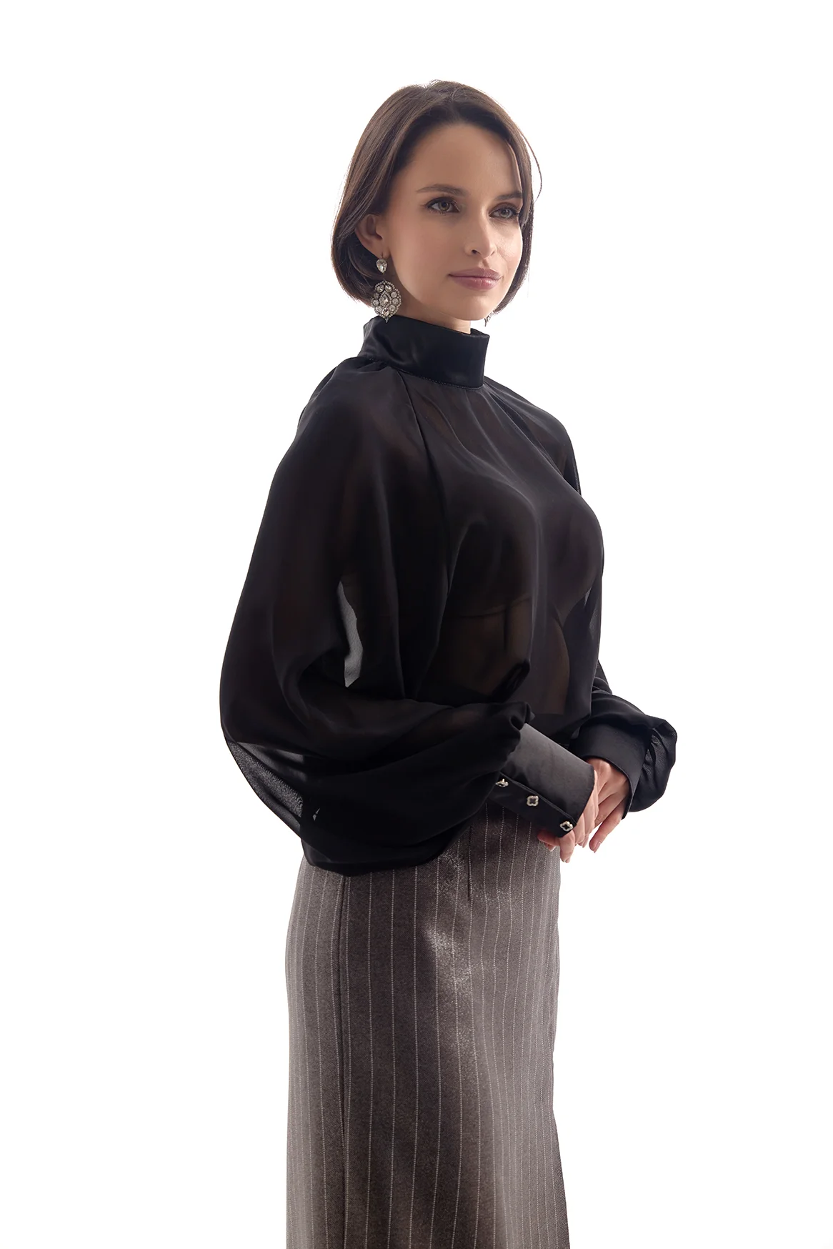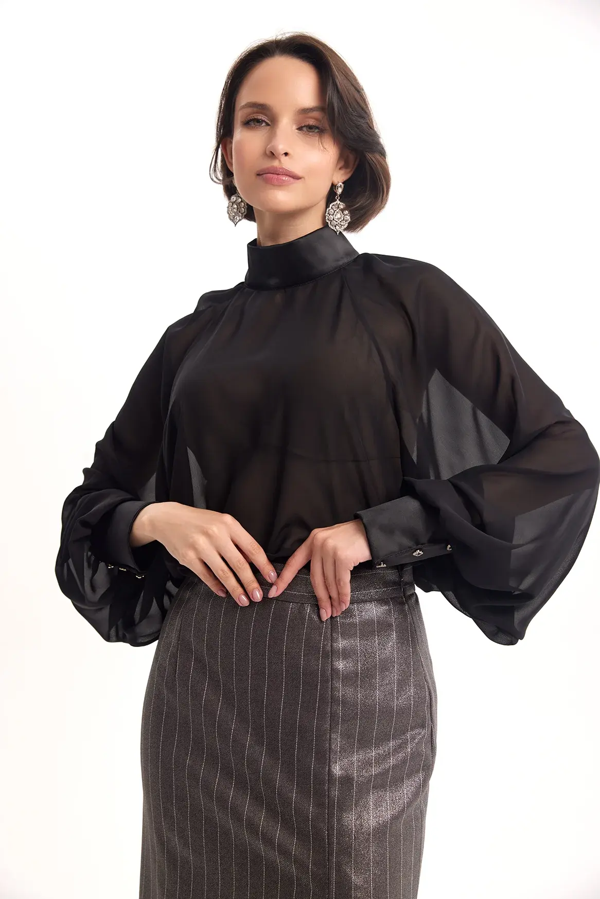 Полупрозрачная блузка свободного кроя из легкой воздушной ткани. Высокий воротник-стойка и длинные рукава создают изысканный силуэт, а прозрачная текстура добавляет образу лёгкости и утончённой смелости.