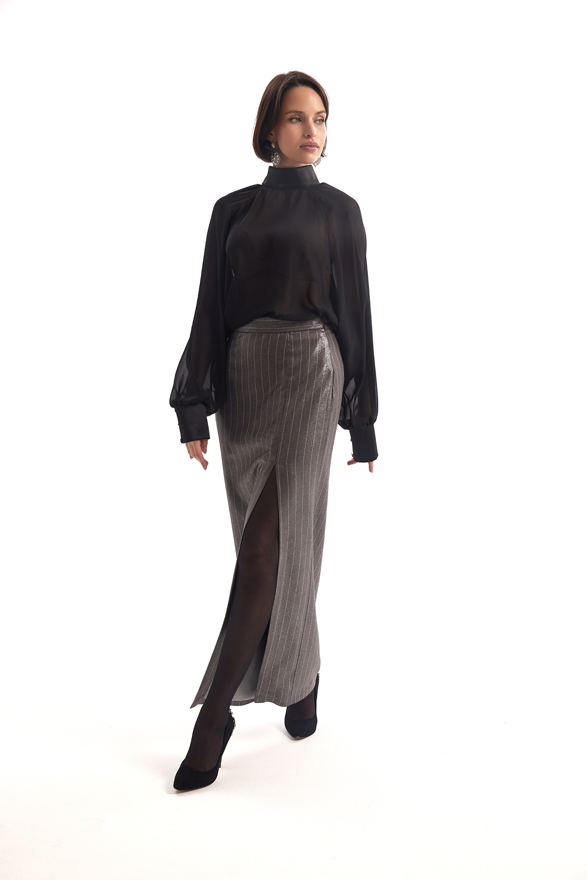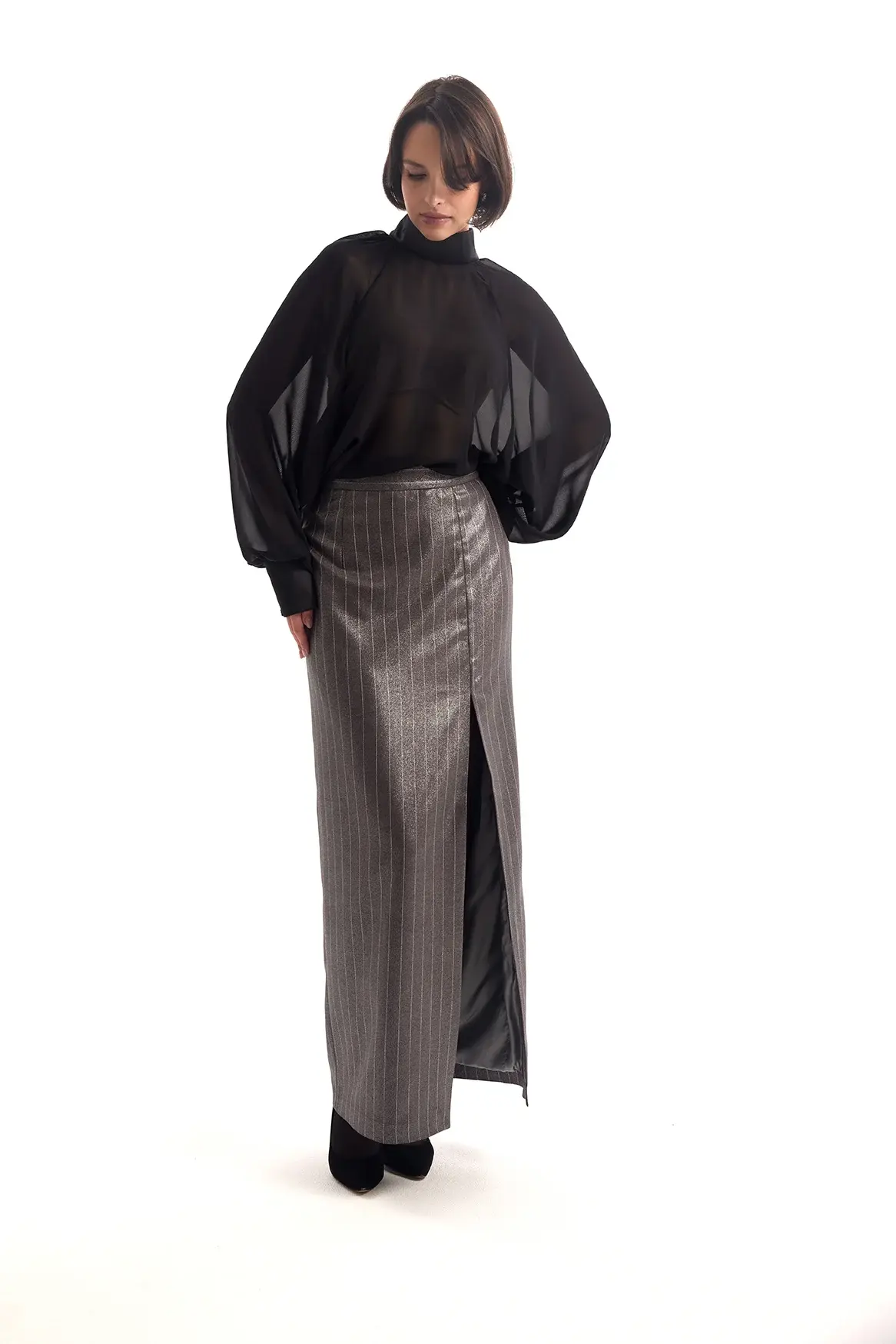 Эффектная макси-юбка с высокой посадкой и разрезом спереди. Выполнена из ткани с металлическим блеском и тонкой вертикальной полоской, которая визуально вытягивает силуэт. Лаконичный крой и акцентная фактура делают её идеальным выбором для вечерних выходов и стильных мероприятий.